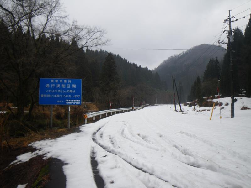 ①県道37号は姫路集落の外れで除雪されず、看板前で駐車します