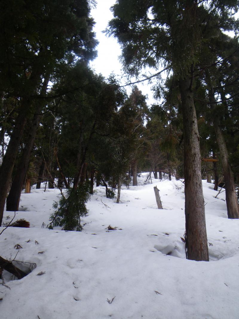 今回は数ある登山口の中で鳥取側の姫路からが最も最短ということで選びましたが、やはり長い林道歩きから始まります。今年も暖冬、さらに昨日の雨でさらに雪の量が減ったのではないかと思いましたが、除雪最終地から雪が残り、河合谷林道終点から200mくらいの雪解け区間があったものの、基本スノーシューでないとはまって進めない状態が続きました。それでも例年に比べれば少ないのは間違いないです。