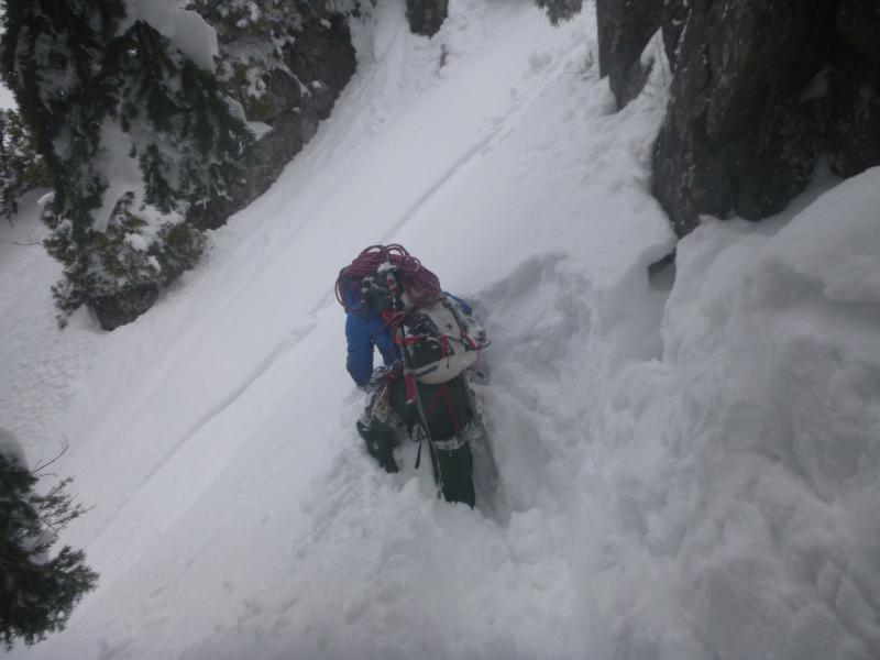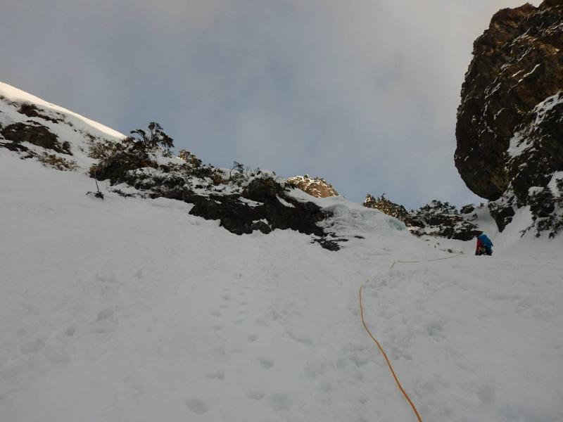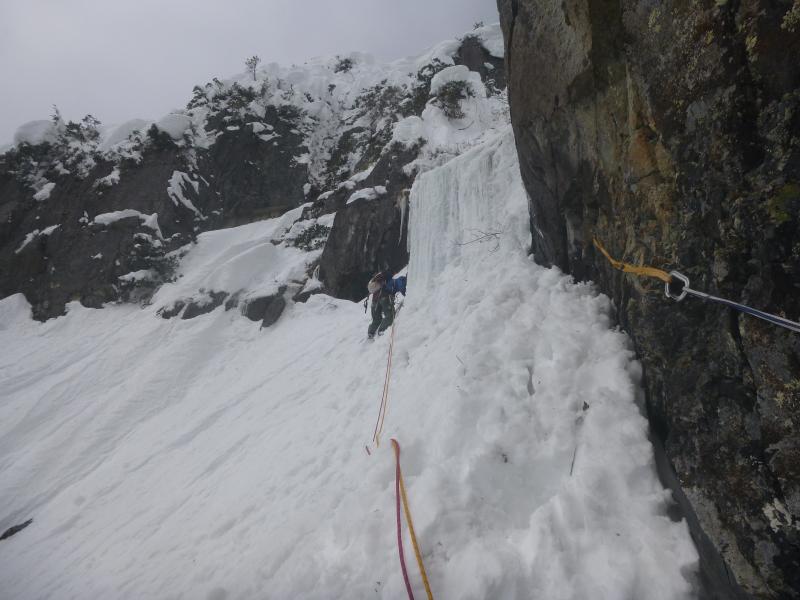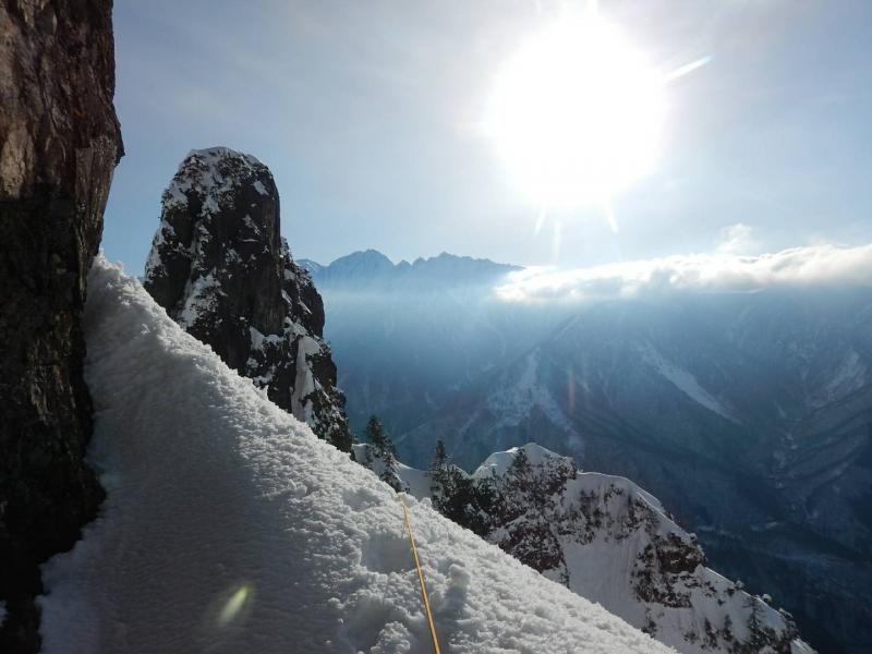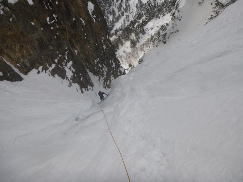本ルートは南東に面していて日射の影響を受けやすく、ルンゼ内にいる時間も長いので雪崩などに細心の注意が必要です。 当日は曇りで抜群のルンゼクライミング日和でした。