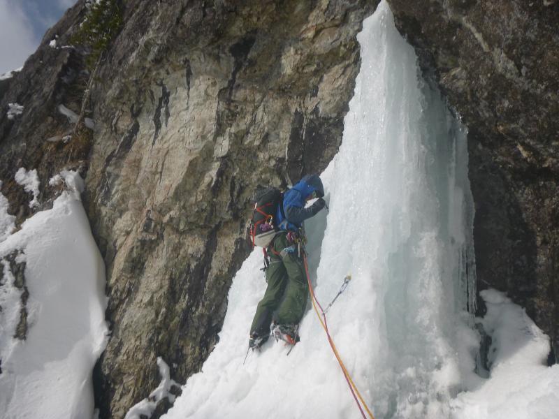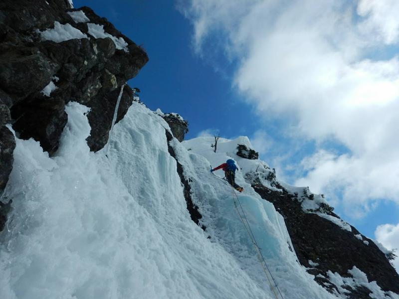 大洞穴は完全に埋まり氷瀑が発達していて、WI3程度のアイスクライミングが2P続きます。