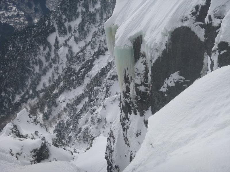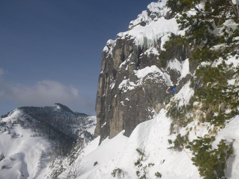 スタカットからコンテに切り替えつつ、雪壁をトラバースして本峰フェースの大洞穴へ。
