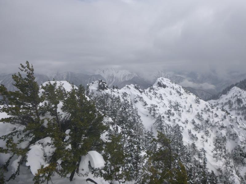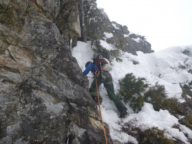 その後はブッシュ登り、ラッセル、ミックス帯を2Pこなして稜線へ。
