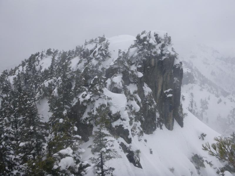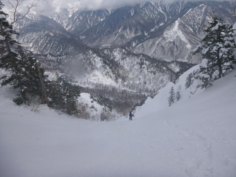 雪質は登ってきた南東面とはうってかわってパウダーの胸~腰ラッセル。 樹林帯なので落とし穴が多く、何回か踏み抜いて穴にはまり大変でした。