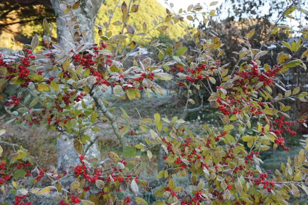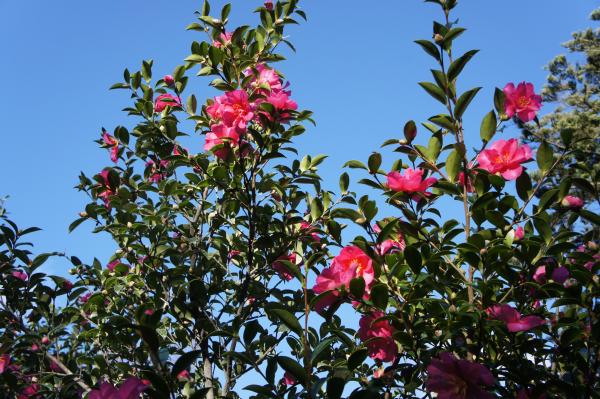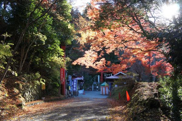 山頂の神社まで車で登れてしまいます。朝焼けの紅葉と寒椿がとても綺麗でした。