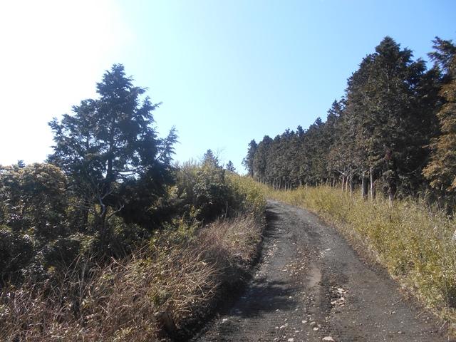 尾根に乗るとすぐに新しめの林道に出る。弾性ヶ原まで林道を行きます。