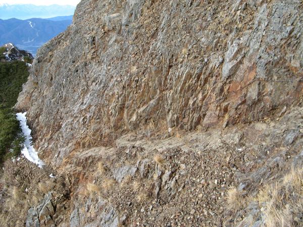 この日の危険箇所はギボシのトラバース部分。基本的に脆く不安定な足場が続き、鎖も何箇所か張られています。慎重に足を置く場所を選んで通過しましょう。トラバース後の下りもガレ場で滑りやすいので、浮石には注意が必要です。
