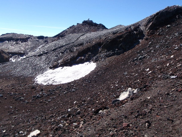頂上お鉢では前日降った雪が少し残っていました、霜柱を踏みつけながら歩きました