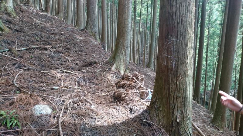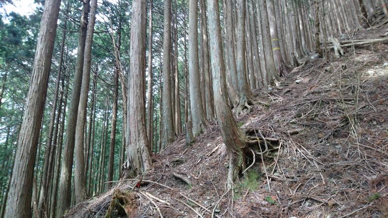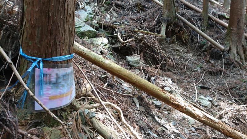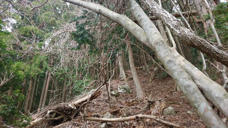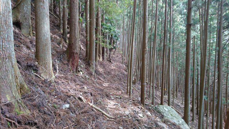 集落を高台に登って行き、鹿よけ柵を開けて山へ入ります。右手に踏み跡が付いているので歩いていき、尾根筋への登りと川の音がするトラバースの道とに分かれますが、ここを左手の尾根側へ上がっていきます。