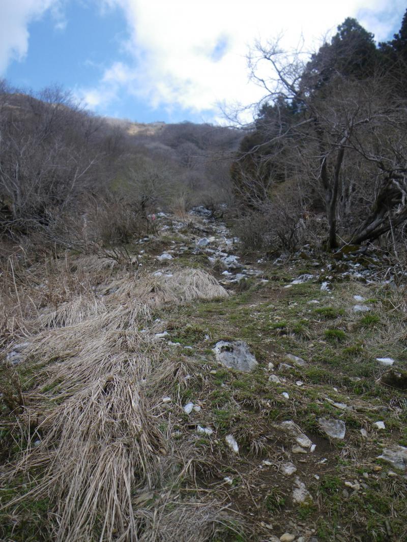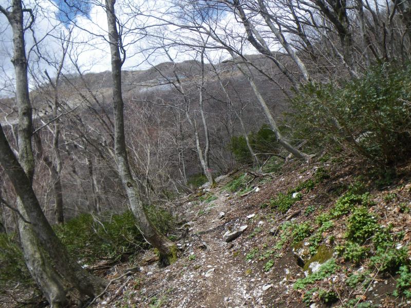 ➃石灰岩混じりのガレた登山道ですが、途中からジグザグ道に変わり樹林帯を抜けます