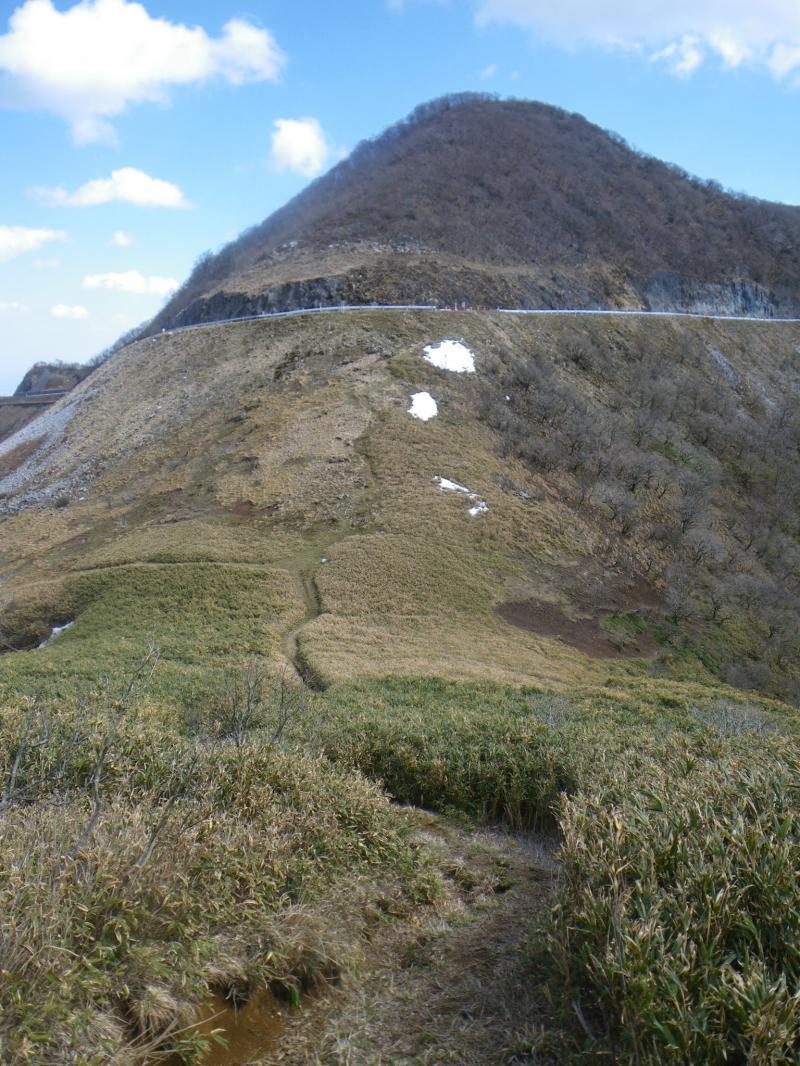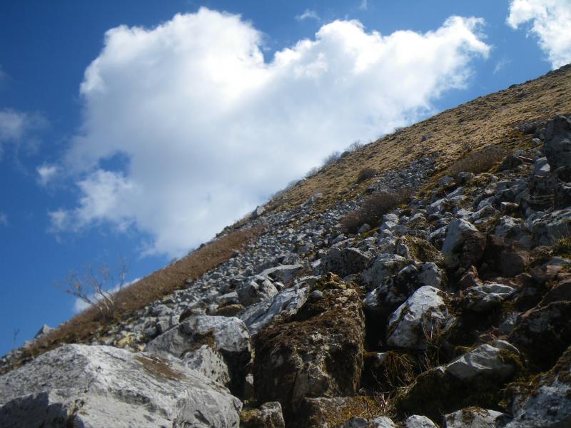 笹又道は初めて歩きましたが、さざれ石公園に駐車したので25分程度はロス、上部の登山口に駐車すべきだった。登山口から既に伊吹山ドライブウェイが見えていて、以外と近い印象、登山口周辺にはカタクリやスミレが咲き乱れ、遅い里の春といった感じ。稜線まではジグザグの急登だが、横の伊吹山ドライブウェイの高さが近づくにつれ実感できます。稜線まで上がると、静馬ヶ原までトラバースになりますが、今日は強風で吹きさらしの為にジャケットがないと寒い。伊吹山の残雪はなさそうだが、数日前にはこのトラバースに雪があり、歩きにくかったろうに。冬は伊吹山ドライブウェイまで上がってしまったほうがよいかもしれない。