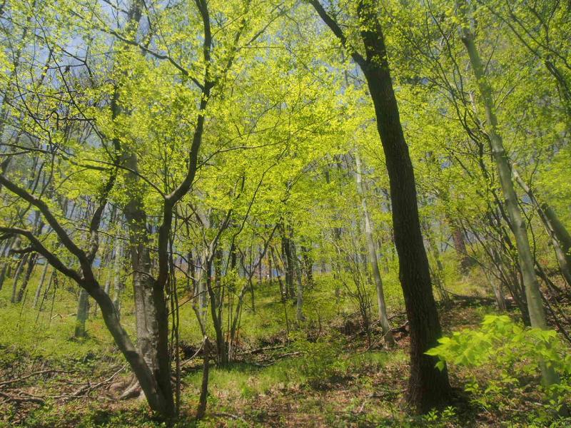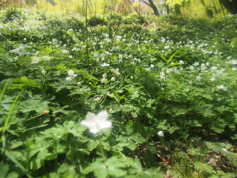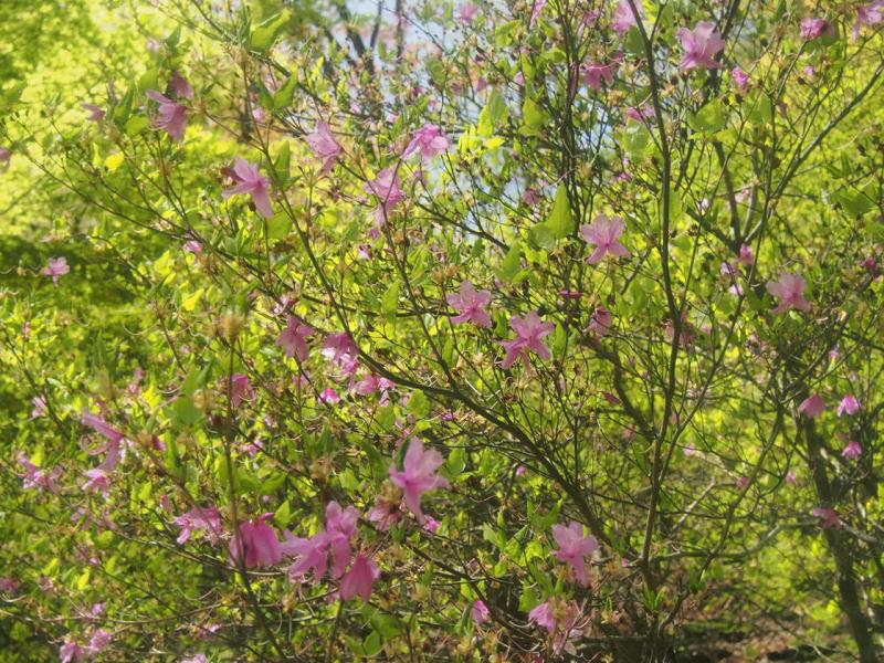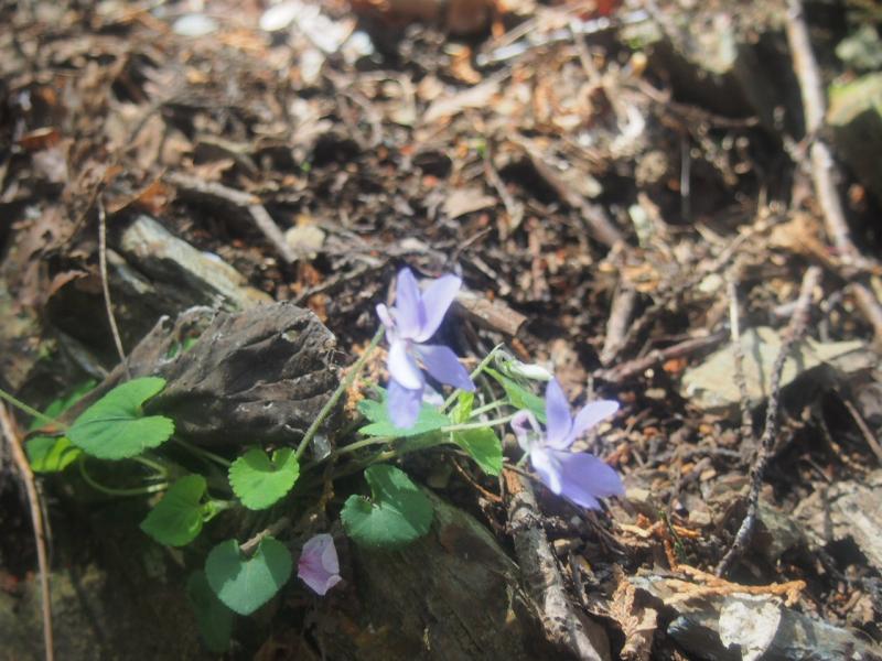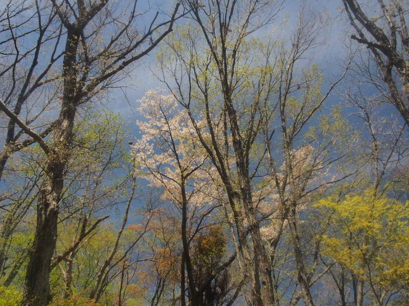 新緑の淡い緑と青空のコントラストがとても綺麗で、花はヤマザクラ、ニリンソウ、ヤマブキ、ミツバツツジ、スミレなどが咲いてました。