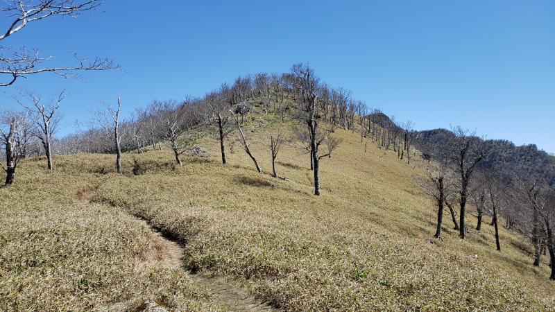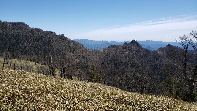 駐車場から釈迦ヶ岳までアップダウンを繰り返しながら登ります。大峰山系らしい笹の群落を抜けて気持ちいい登山が楽しめます。正面に釈迦ヶ岳、右奥には大日岳を眺めながら高度を上げていきます。