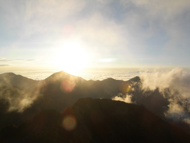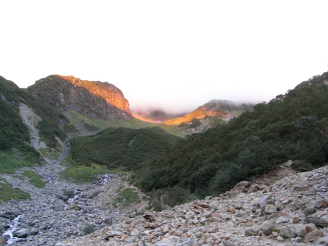 3日目にやっと晴れまして、一路横尾尾根へ。常念岳越しにご来光☀