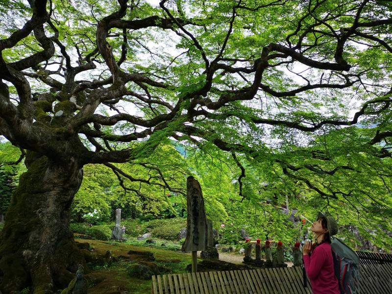 第八番・西善寺は静かな高台にあり、樹齢600年のコミネカエデが有名です。秋の紅葉も見物でしょうが、この日は柔らかな緑色に覆われて庭全体を明るく彩っていました。