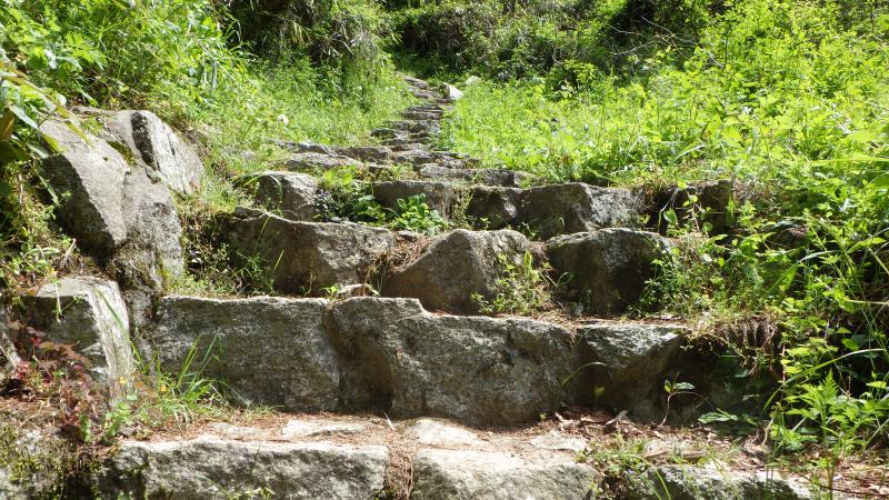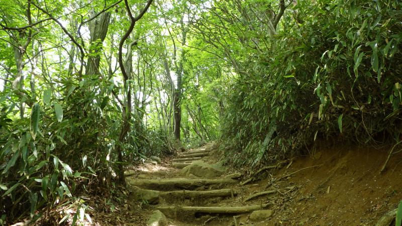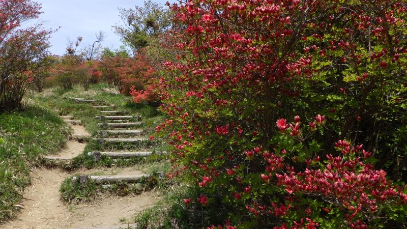 階段道はほぼずっと続くのでしんどいですが、新緑とツツジがとても綺麗で癒されます。