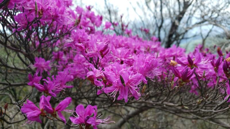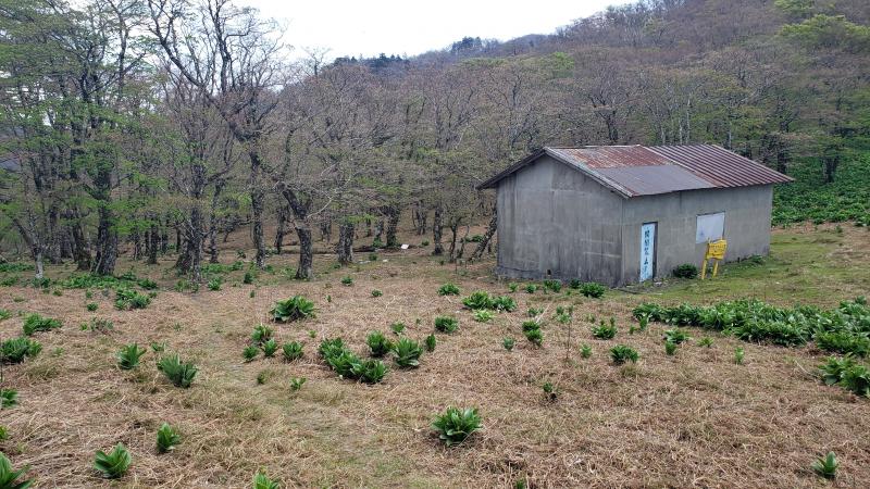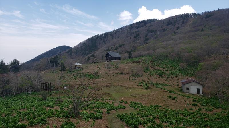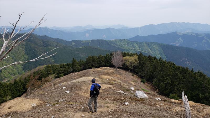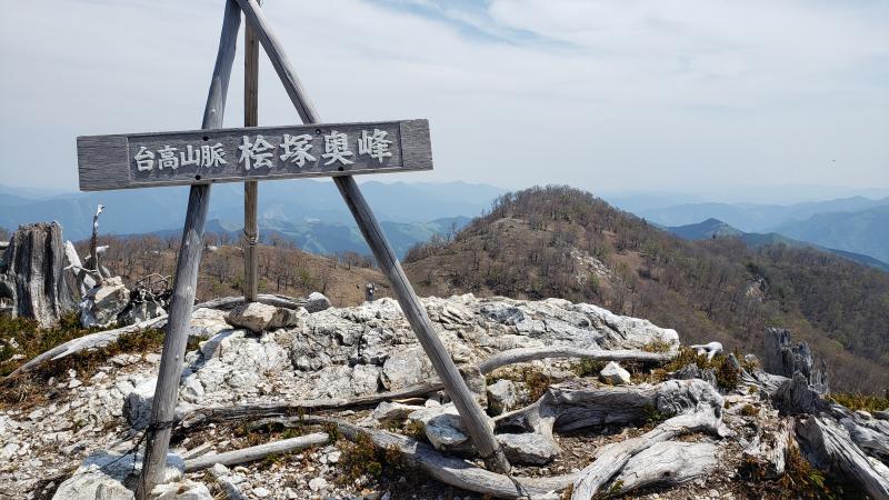 1時間ほど登れば植林帯を抜け、台高山系を見渡せる桧塚に到着します。そこから稜線沿いを歩いて桧塚奥峰へ。奥峰山頂から先程いた桧塚が見えます。1時間ほど下ると明神平に着きます。バイケイソウの群落の中でしばし休憩し、天理大学ワンゲル部の避難小屋横からワサビ谷へ。