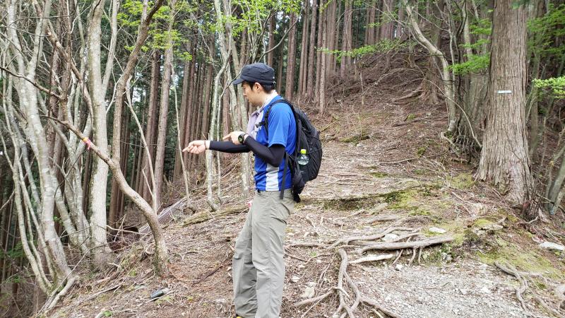 まずは駐車場から林道を歩いて登山口へ。稜線までは植林帯の中をひたすら高度を上げていきます。