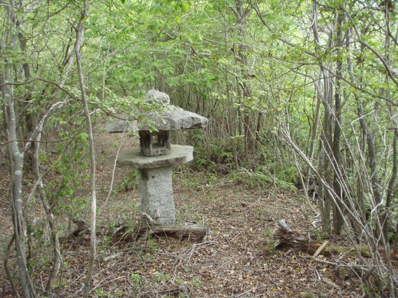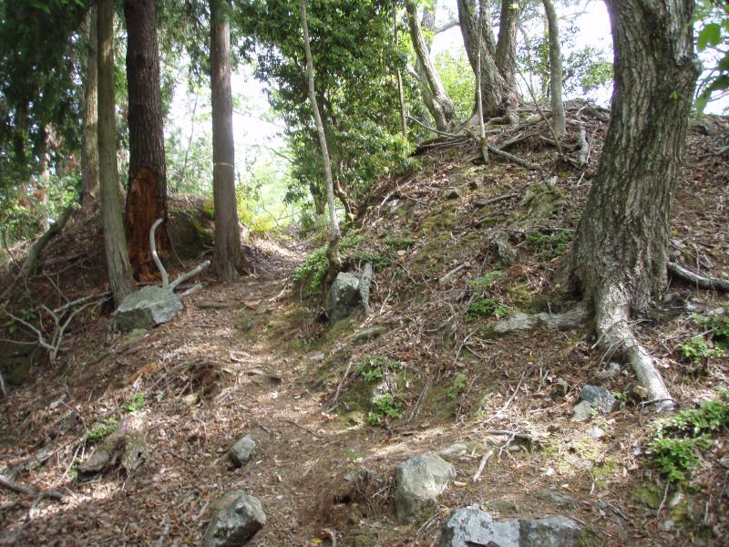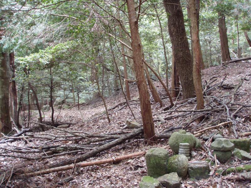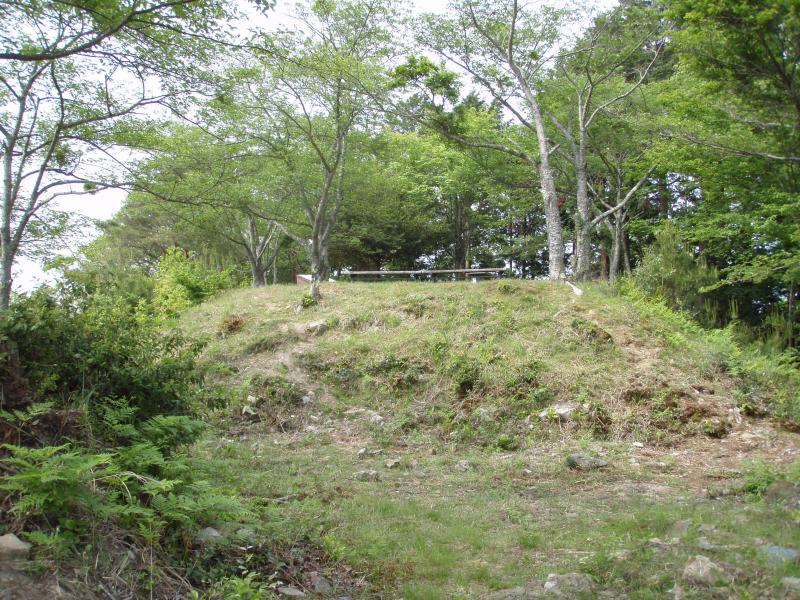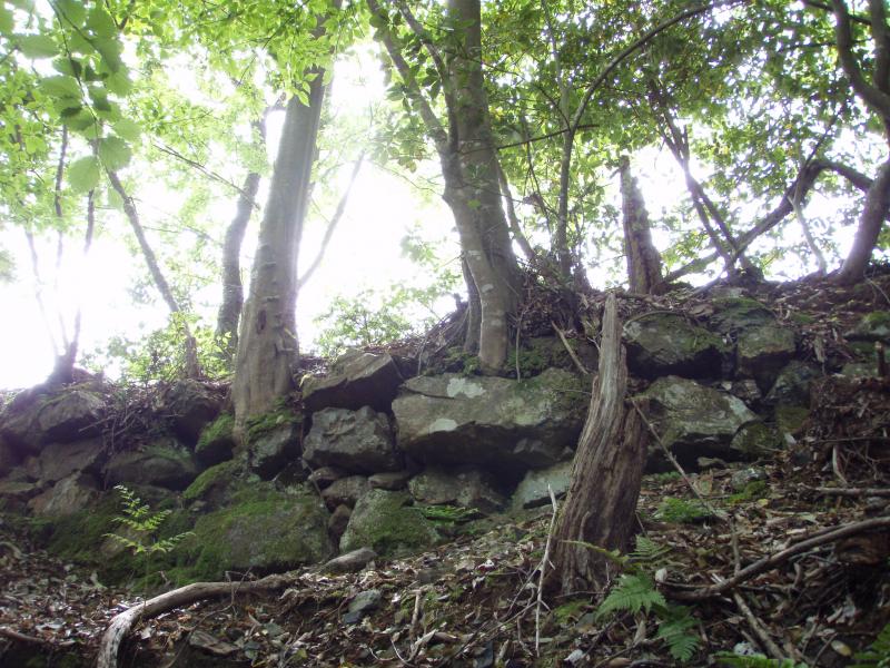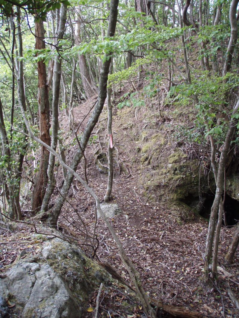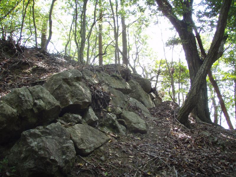 本丸の北端には天然の要害となる展望の良い大岩あり。他の部分は石垣などで補っていたようですが、その一部だけが残されています。本丸から尾根伝いに南に向かい、岩場を下ると内藤土佐の曲輪あり。本丸から西に向かうと内藤和泉の曲輪があり、堀切の下部には謎の洞窟があります。