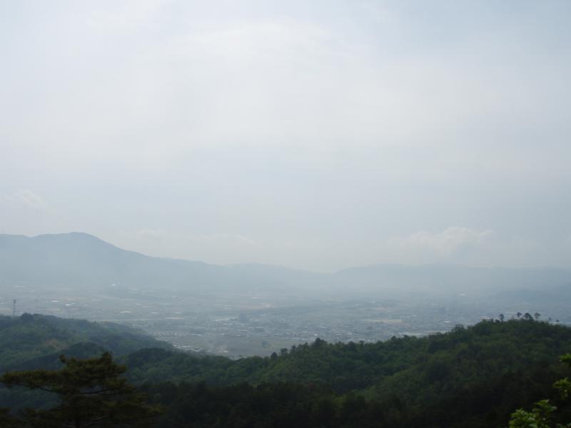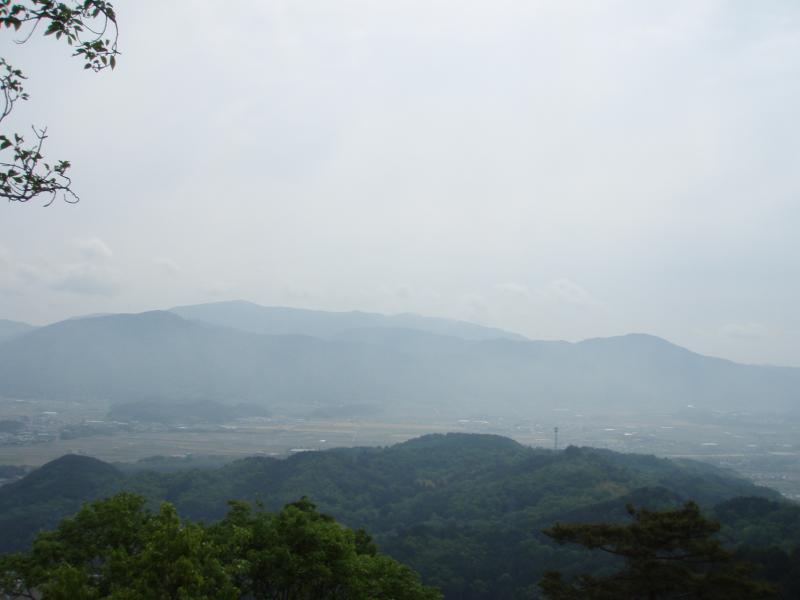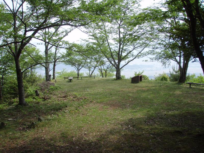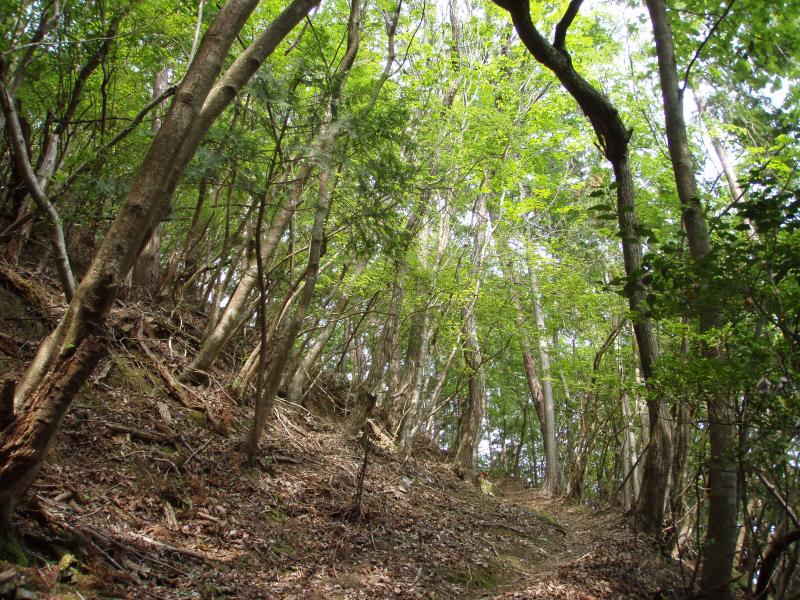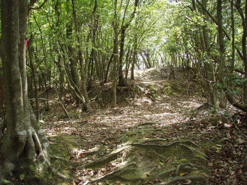 登山道から横を見ると山全体が急勾配な斜面で構成されており、丹波国に侵攻した明智光秀の軍が苦戦した様子が分かります。30分ほどで城山の山頂にある八木城・本丸跡に到着。三角点なし、展望良好、本丸の西端に「金の間」あり。気温23度で蒸し暑い。