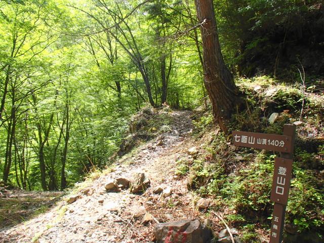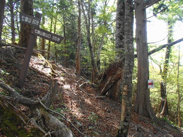 - 車道終点→(70分)→七面山登山口→(120分)→林道終点→(30分)→神仙平→(30分)→大峰奥駆道出合→(35分)→楊枝ノ森→(50分)→七面山東峰→(50分)→アケボノ平分岐→(20分)→七面山登山口→(60分)→車道終点