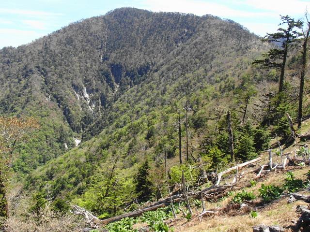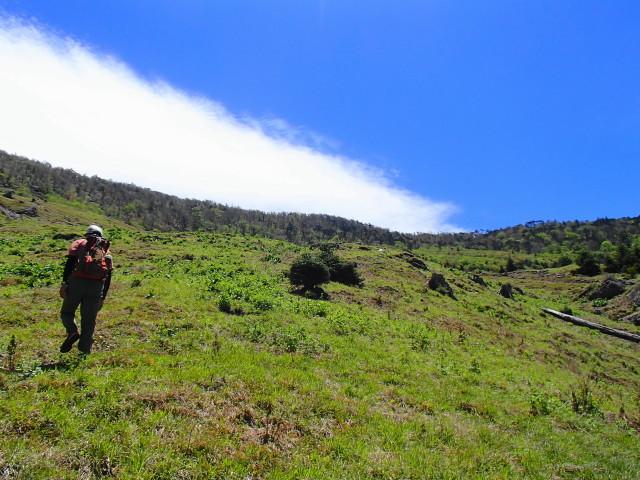 目の前にある稜線に向かって直登するしかないです。私たちは礫の堆積した筋をつめて稜線に上がりました。歩きやすい登りやすい所を詰めてください。