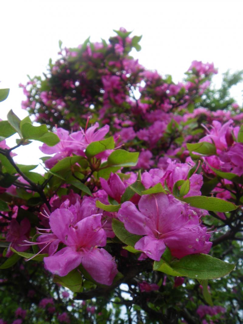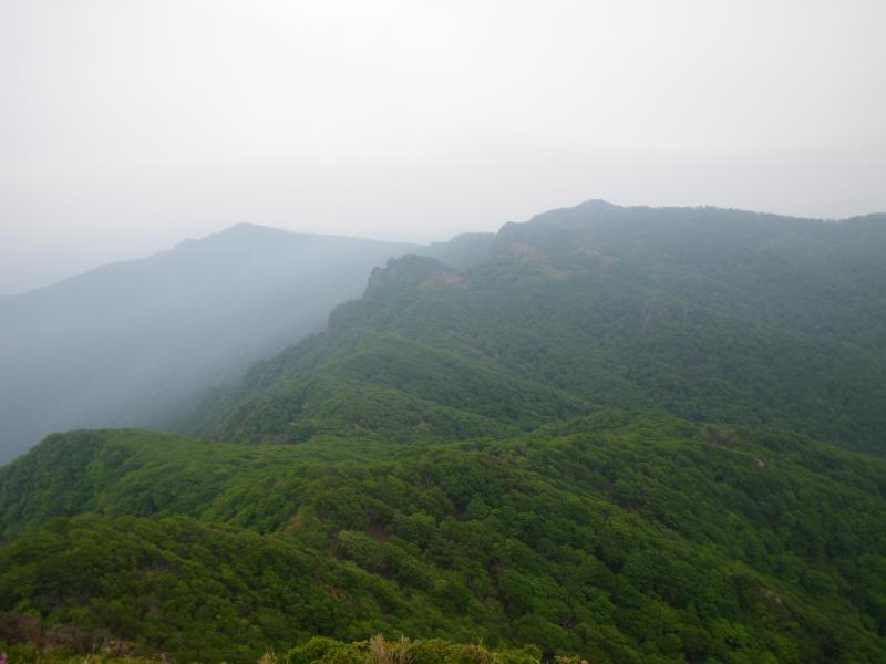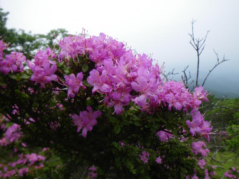今日のメインであるオオヤマレンゲは九合目小屋下部にすぐにわかる白い花がたくさんありました。もう枯れているのもありましたが蕾もあり、開花中といったところでしょうか。大峰で見たオオヤマレンゲは目線でしたが、ここは背が高い感じで下から撮る感じになります。小屋から直接、山頂に向かいますが、山頂手前でなんとか終わりかけのミヤマキリシマも見れました。曇っていたのでうっすらとしか展望はなかったですが、山頂から他の登山口に向う登山道は一気に崖を下っている様子で急なのがよくわかります。緑の稜線がひたすら続く古祖母方面も魅力を感じますが、本州にいる限りは足を踏み入れないだろうと思いながら山頂をあとにしました。
