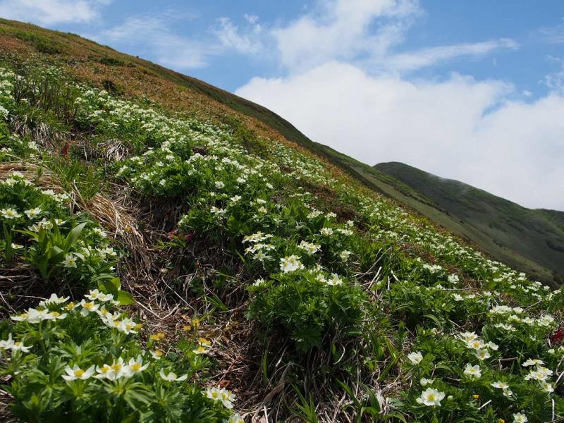 平標山と仙ノ倉山の鞍部にはハクサンイチゲやハクサンコザクラ、チングルマ、ミヤマキンポウゲなどがいっぱい咲いていて圧巻の景色でした♫他の登山者もみんなしゃがんで高山植物を撮影していました(笑)