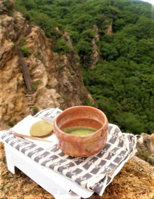 気にせず馬の背のてっぺん岩で野点です。頂きものお饅頭も美味しい。岩の椅子でお抹茶いただくのが一番楽しいです。
