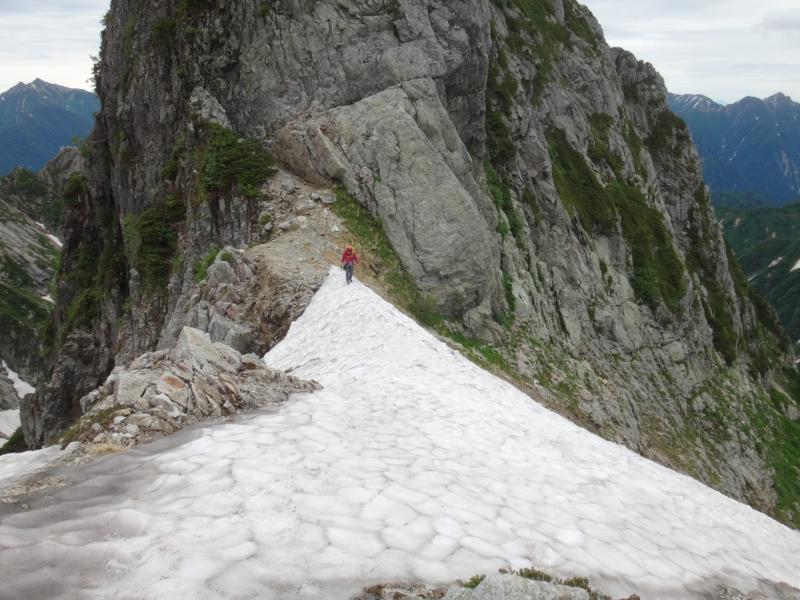 源次郎尾根上、雪渓通過のため2か所でアイゼン装着。山頂直下は雪渓巻ける。