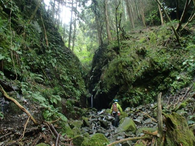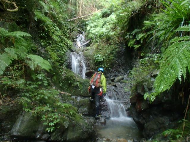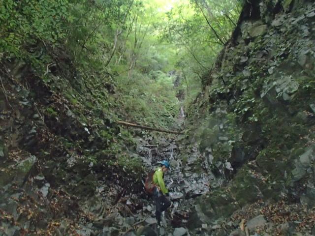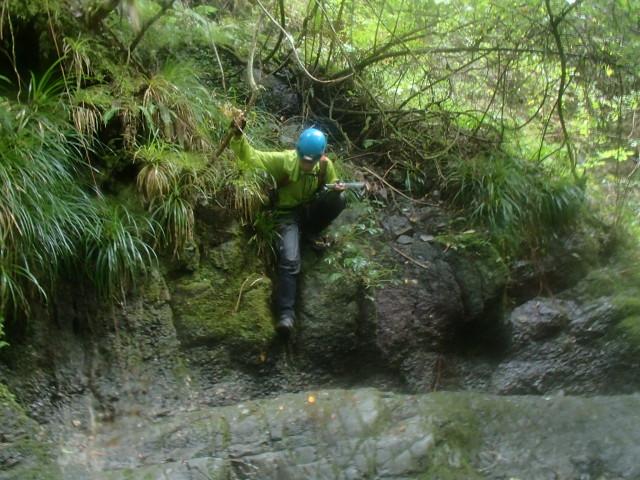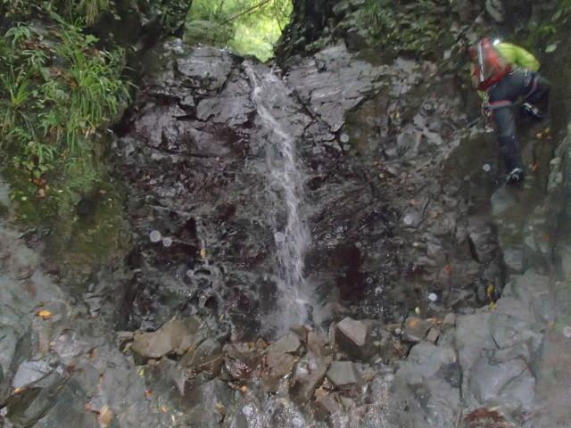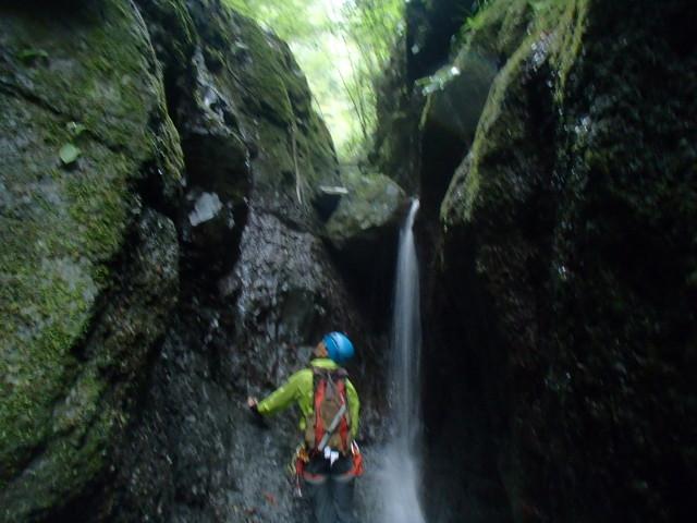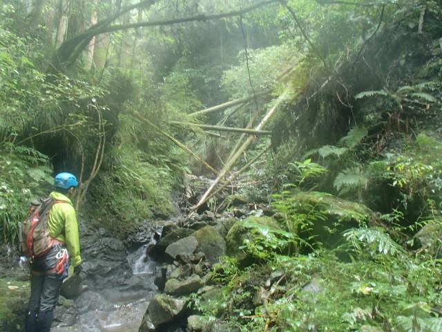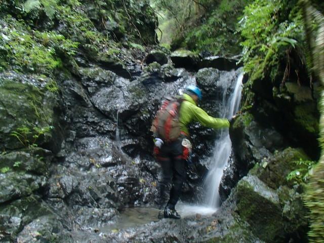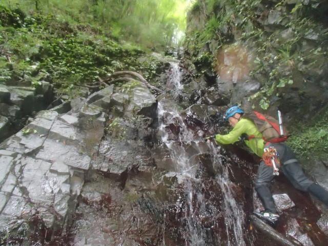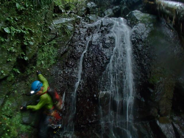 曇りで時々小雨がぱらつくコンディション、沢中は暗く増田さんはヘッデンを付けての沢登りでした。