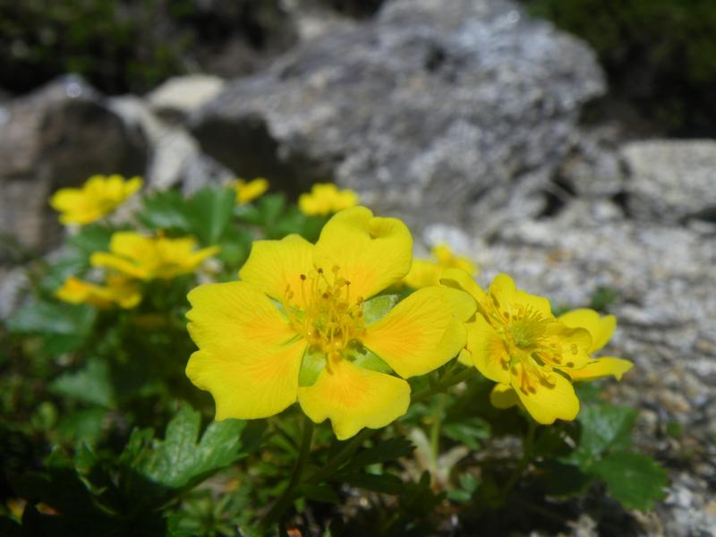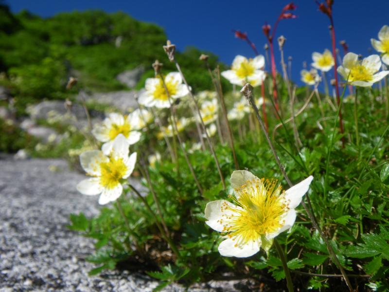 いよいよ三ノ沢岳へ向かいますが、どんどん標高を下げ、途中からキバナシャクナゲが混じるハイマツの中を歩きますので、暑苦しく、足元が見えず、枝に足を取られて、歩きにくい。最低鞍部からはじまる上りはそれほどしんどさを感じませんが、2箇所のロープがありました。頂上直下でようやくホッとする花園があり、ここにハクサンイチゲ・コバイケソウ・チングルマ・シナノキンバイ・ハクサンチドリが共演していました。雲が出てきて、御獄や白山のような遠い山は見えずじまいでしたが、山頂には岩の上に小さなプレートが乗っていて、岩越しに中央アルプスの主稜線が映りこむ画像を収めましたが、なかなかかっこいい。