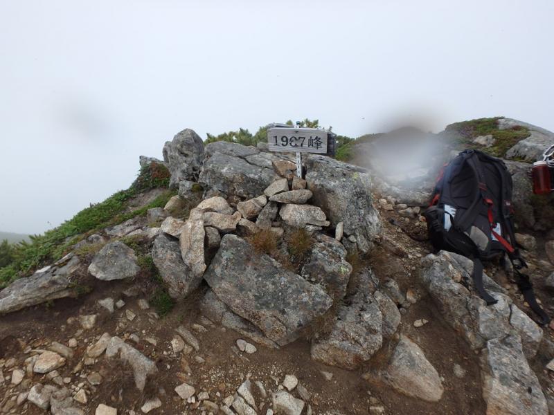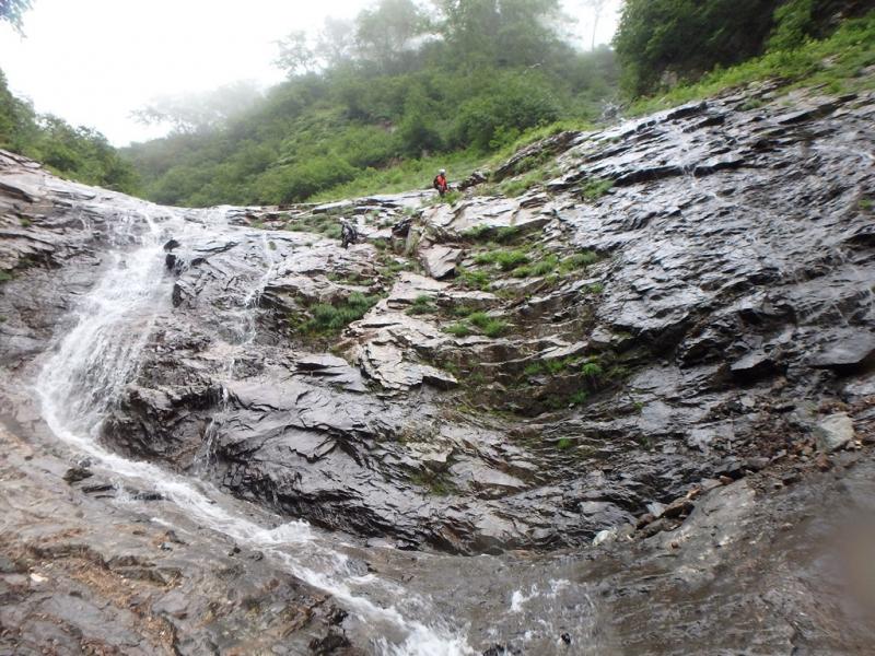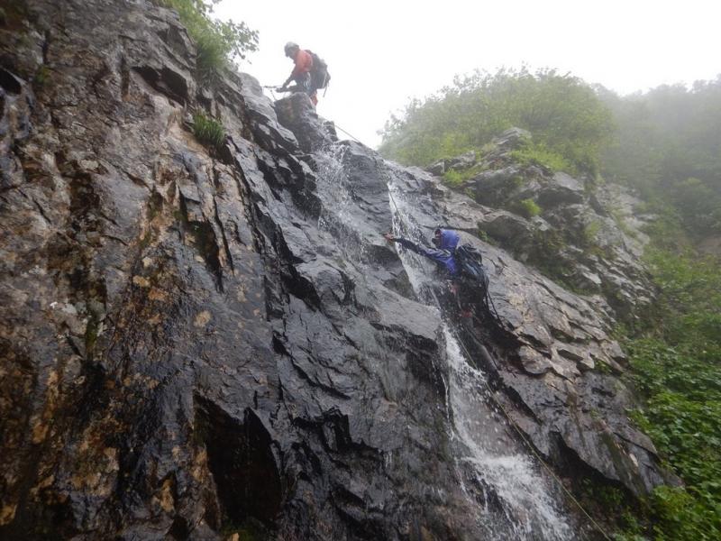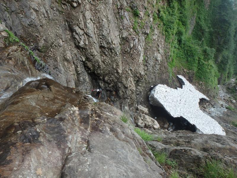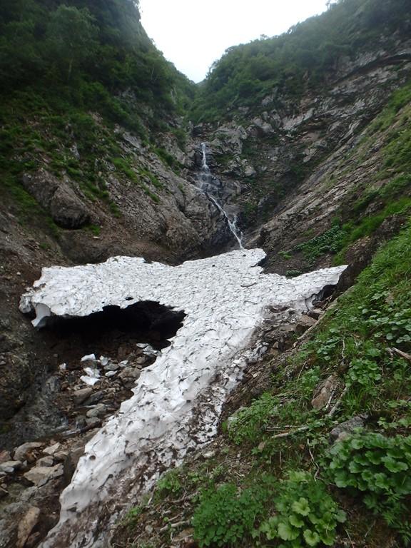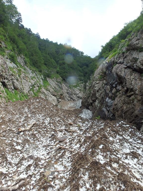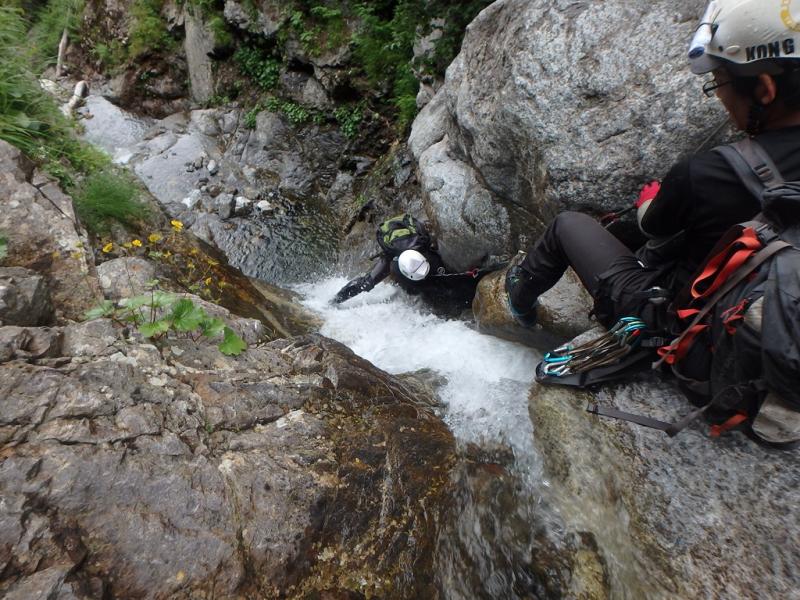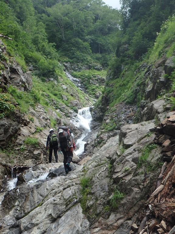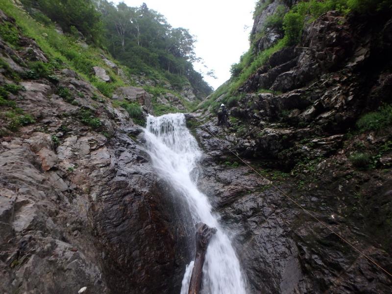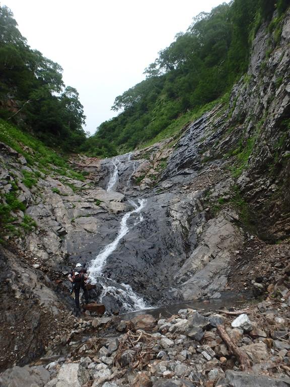 今回は下降しました。1920Pと1910Pの間のコルから沢筋目指して下ります。上部はスラブ状の滝が続き、小滝の連続から下流部に50m大滝。大きな雪渓が残っておりこの処理が登りの時も核心かもしれません。
