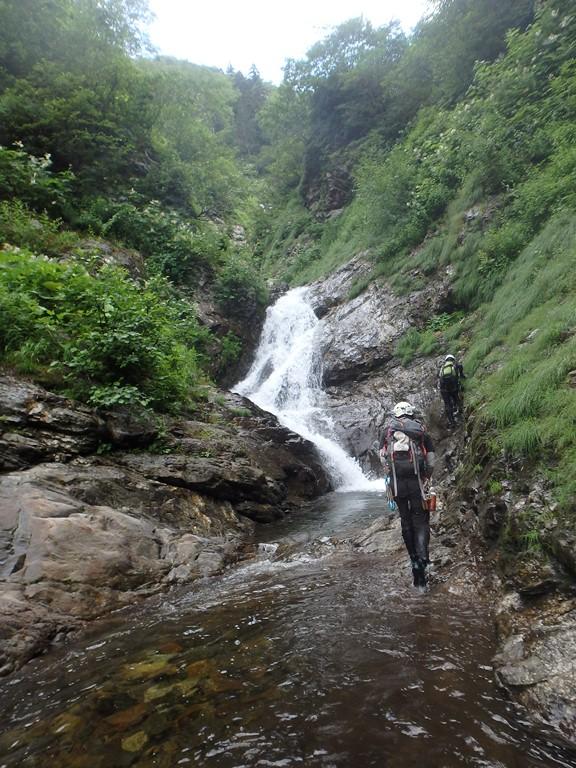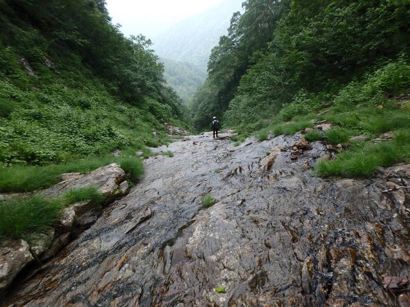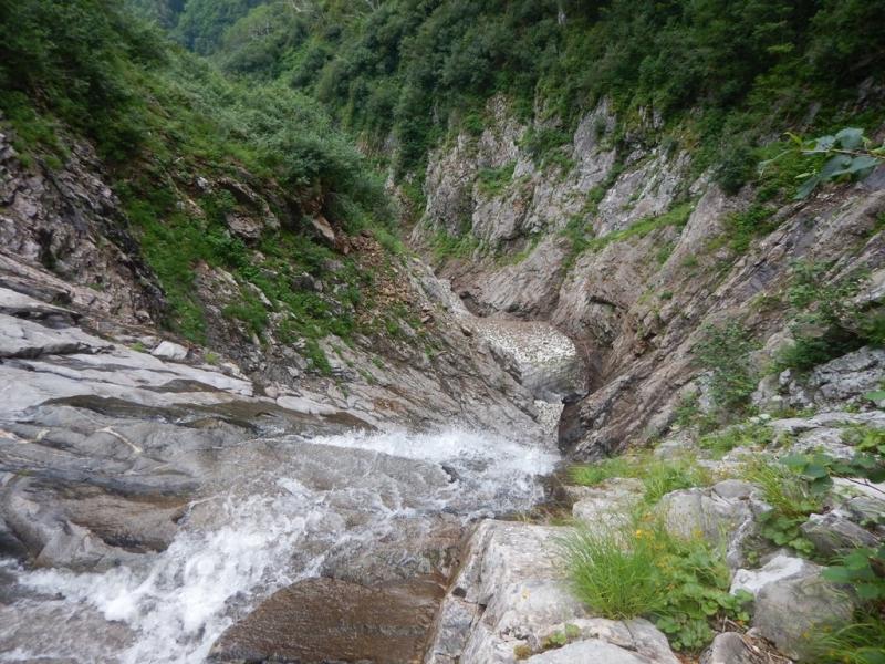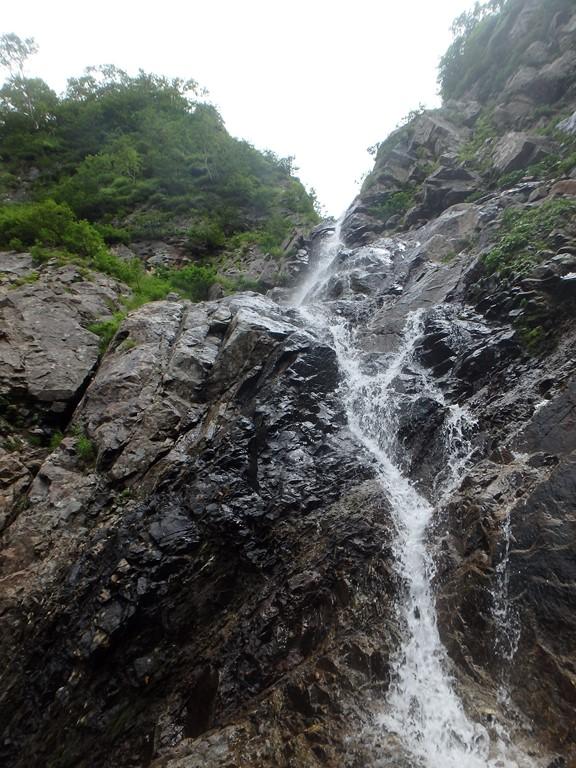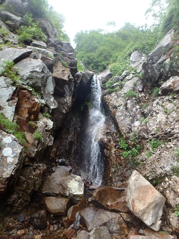 四の沢出合いを過ぎてから滝が始まり沢は狭まり、1800m位まで大小さまざまな滝が連続する。高巻きは脆い草付きや岩壁に追いやられることも多くなるべく直登すると良い。