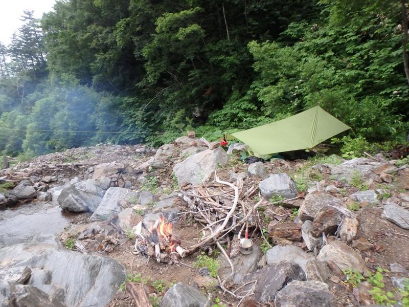 初日は出発が遅れた上に途中で時間をかけすぎてしまい、本流途中で時間切れ。結局、四の沢出会いまでもどりゆっくりと焚き火を楽しみました。本流自体は函状の沢筋に小滝が連続する登り応えのある沢でした。