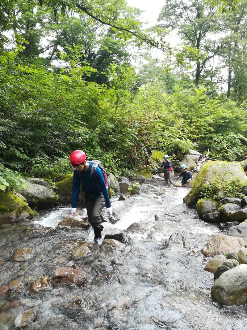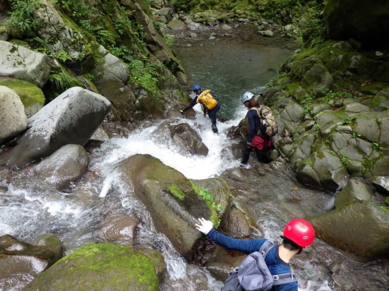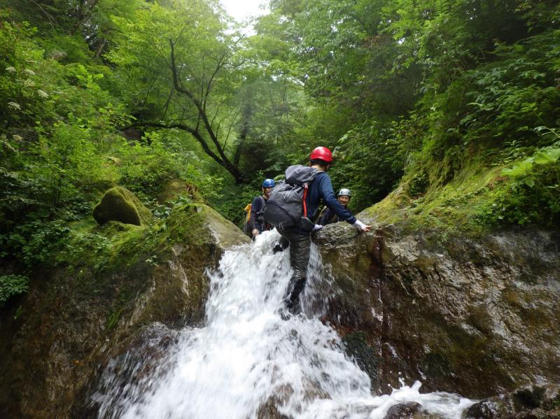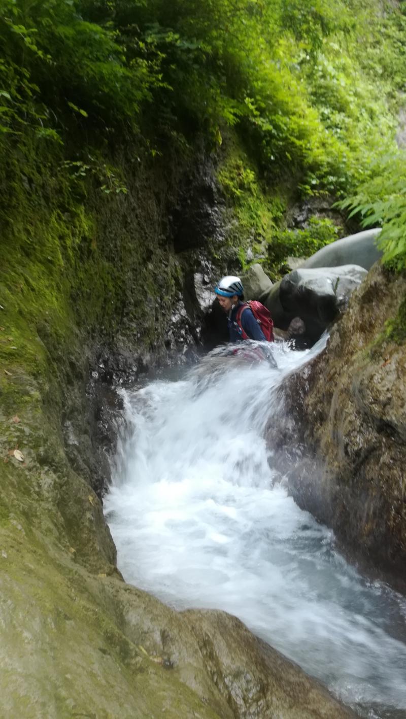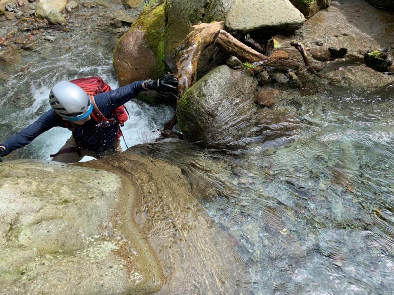 ここ数日天気がすぐれず、沢の様子が心配でしたが、昨年よりはまだ水流が弱く、水の透明度は抜群で、今年初参加の友人は「おおー」と言いいながら沢登りを満喫していました。