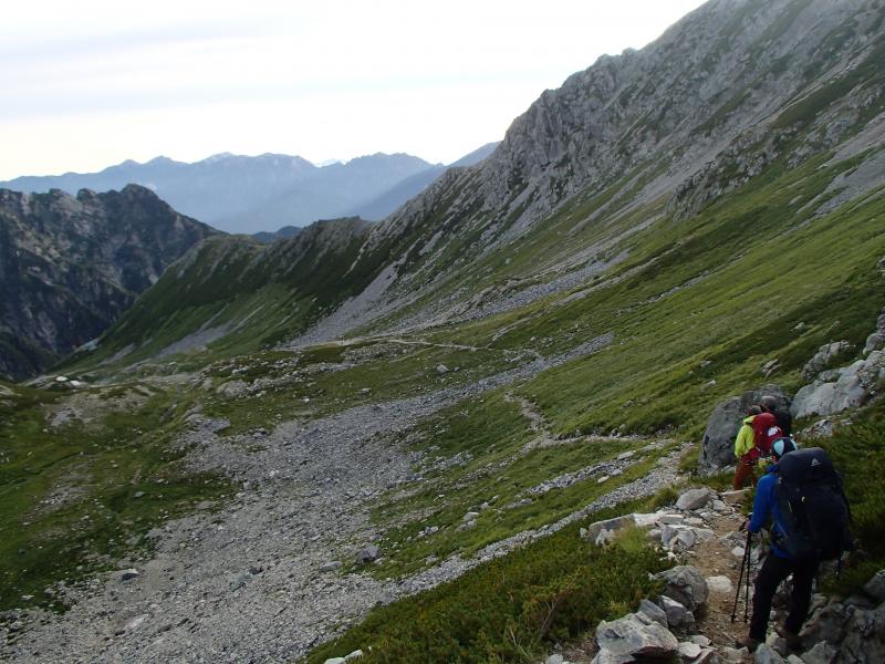 ・明け行く空の下、剱御前小屋への登りをのんびり歩いていきます。途中、何度も剱岳方面を振り返りながら。チングルマが揺れるのを愛でながら。各々旅情に思いをはせながら。