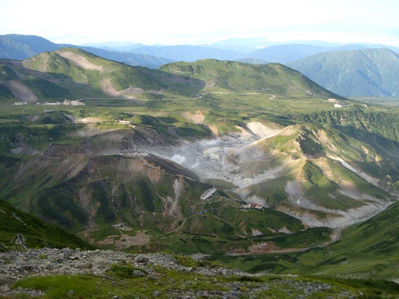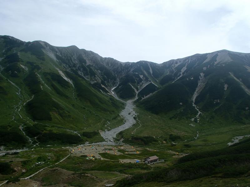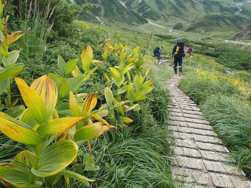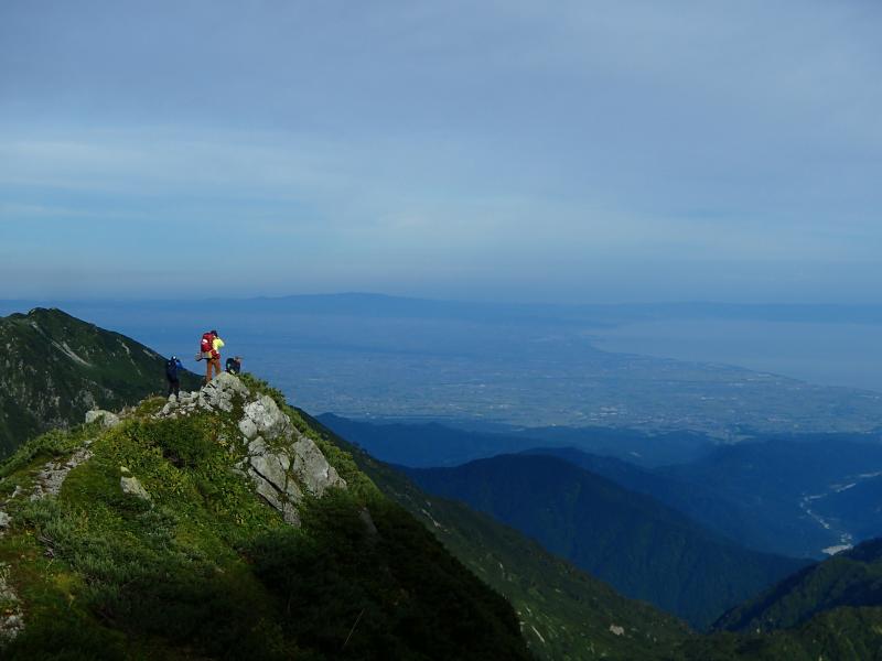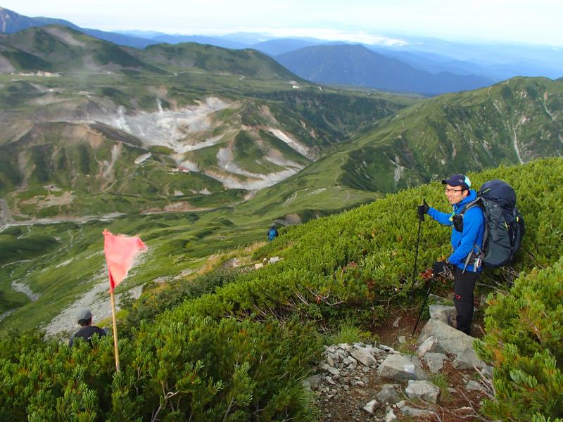 ・スタートからしばらくは平坦なコースを進みます。途中で90度に下るコースへ入っていくのですが、このポイントの少し先に絶景ポイントがあり、日本海まで見渡せます!前方に日本海、左前方には奥大日岳、斜め後方には槍ヶ岳が遠望でき、眼下には雷鳥沢のキャンプ場。いやぁ~、贅沢です!!