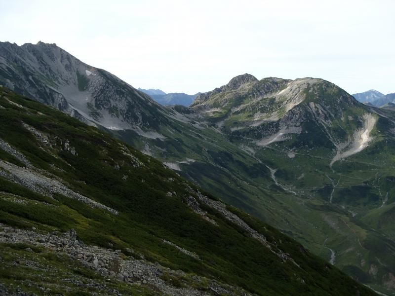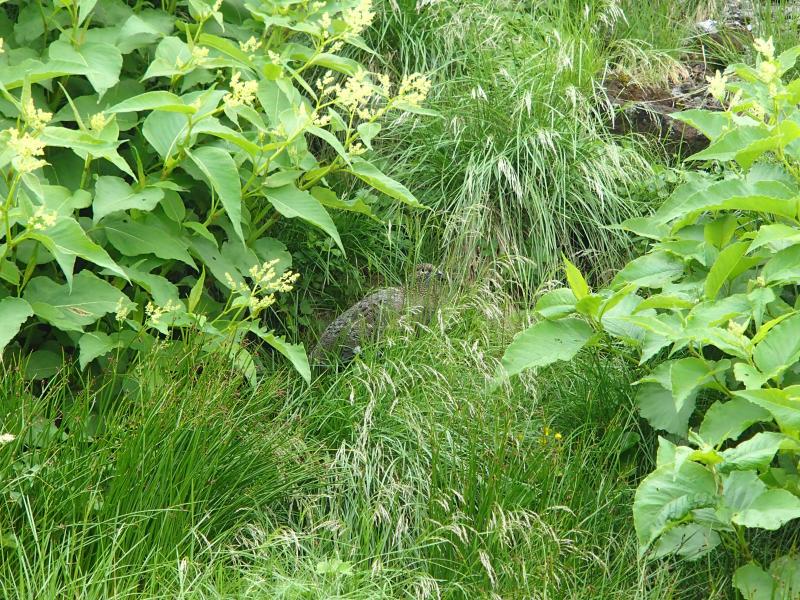・ややザレた下りを雷鳥を探しながら下っていきますが、残念ながら雷鳥を発見できないまま沢沿いまで下ってきました。全員が諦めかけたその時!前方の登山者がなにやら写真を撮っています。そーっと近づくとなんと雷鳥が!!まさか沢沿いで雷鳥が見れるとは思っていなかったのでびっくりですが、全員やや興奮気味にカメラで雷鳥を追います。草むらから出てきてくれなかったのできれいにフレームには入りませんでしたが、まぁ満足です。