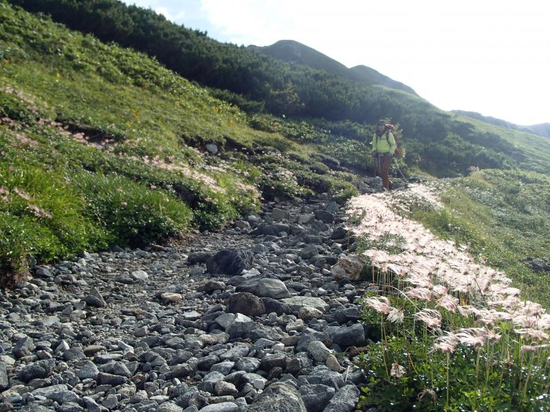・下りに入ると最初は結構急坂です。足元には注意していきます。しばらく行くと傾斜がゆるくなって歩きやすいコースに変化。チングルマが登山道わきに揺れ、朝日を受けて輝いています。癒されます。