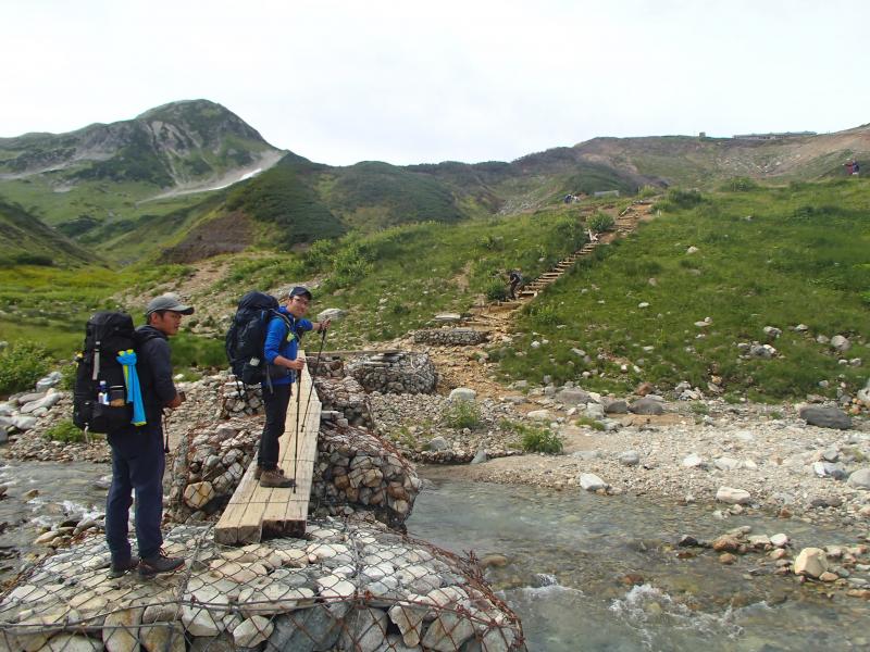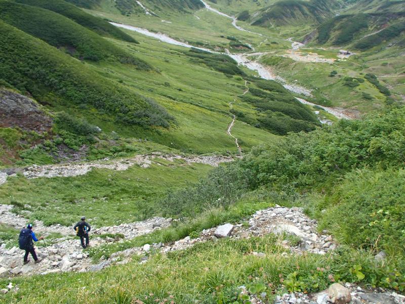 ・奥大日岳方面への分岐にあたる新室堂乗越にて休憩を取り、これからの予定について相談。ペースが良ければ称名滝を見て帰ろうなど、楽しい会話が弾みます。そして中村氏は「あとは雷鳥が見れればフルコンプリートですよ!」との事。そう、ここから雷鳥沢のキャンプ場までの間は、雷鳥との遭遇率が高いハイマツ帯を通過します。楽しみです!!