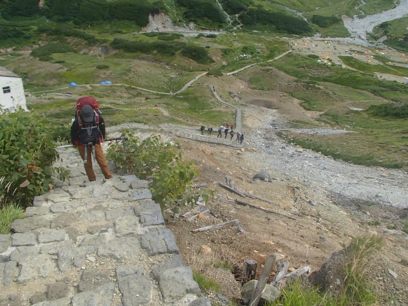 ・その後、木道を歩き、キャンプ場手前の橋を渡って雷鳥沢へ到着。あとは室堂へ登り返して登山は終了ですが、この階段の登りがキツイ・・・。地獄谷が見渡せる休憩ポイントでバテバテの女帝を待って最後の休憩。地獄谷の圧巻の景色を楽しんだあとリスタート。