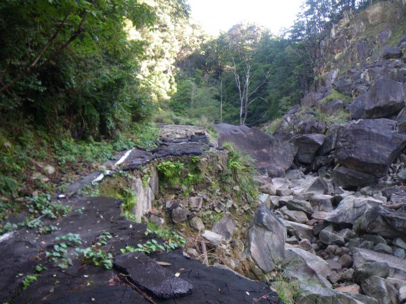 ➁引戸橋過ぎの滝本小学校跡横の林道を進みます。この林道は途中で崩壊し、車両通行止。