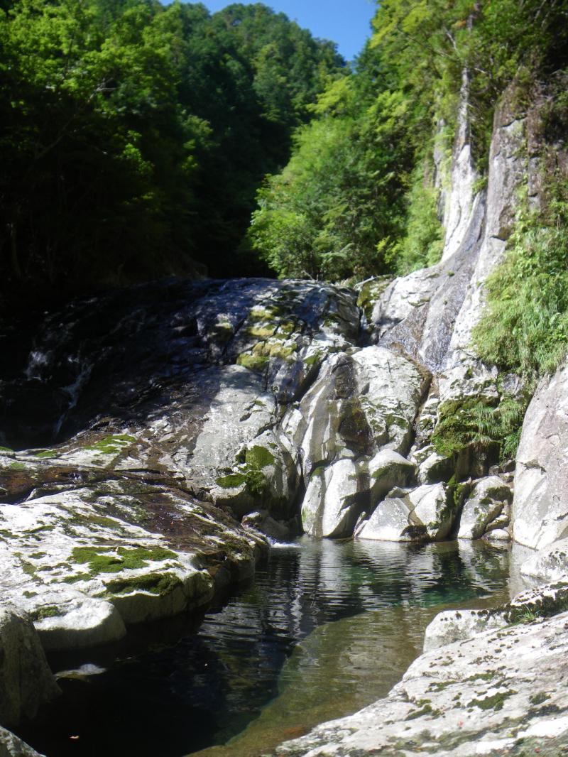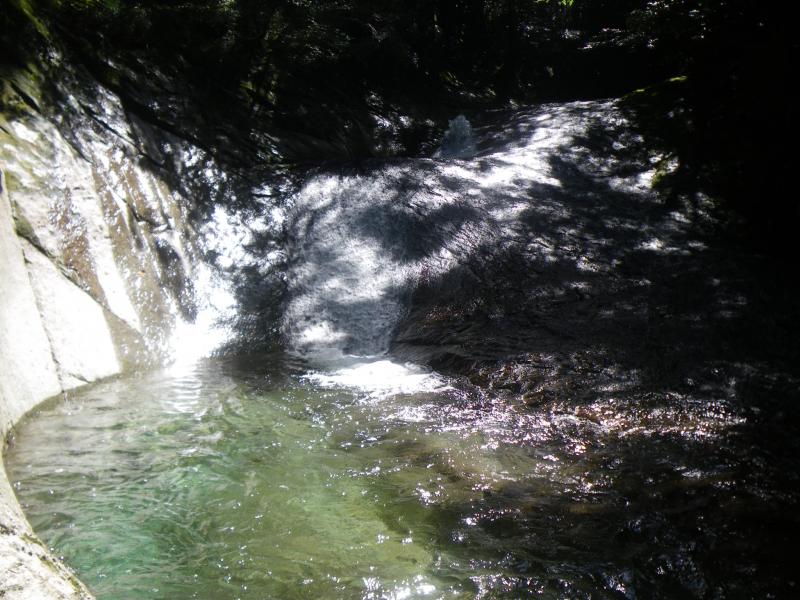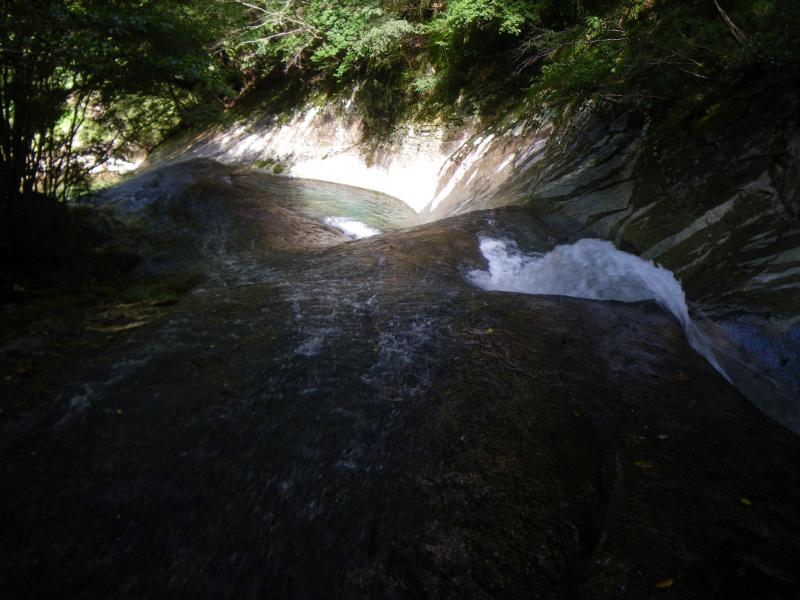 最初の筆藪滝でいきなり大きなプールでいかにも深そうな大きな釜に驚きますが、次の部屋滝は大きな岸壁に囲まれて暗い中でも薄日が差すとなかなか幻想的でした。ここの滝を大巻きしていきますが、一段あがるとバンドのようなところがあり、どちらでもいけそうな不明瞭さの為、右の越前谷へ行かないように注意です。この高巻きが終わると水の色が変わり、ナメが多くなり、楽しくなります。特に屏風滝と亀壷ノ滝の上はナメが連続し、これぞ南紀の沢という感じです。プールにスライダーと遊んで行きたい所ですが、下山路に心配があるので先を急ぎます。