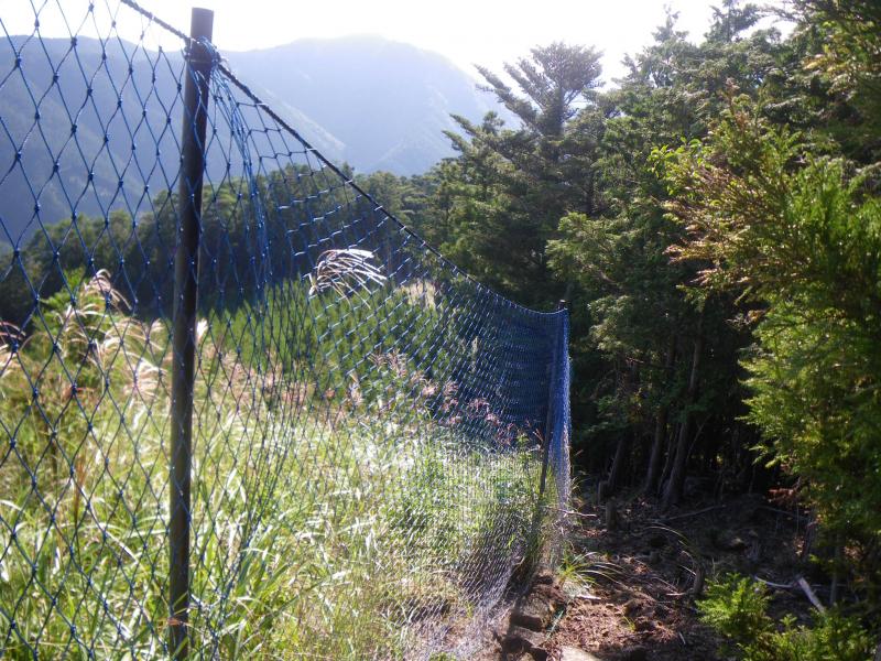 終了点の堰堤はすぐにわかり、丁寧に巡視路の看板もありますから迷うことはありませんが、すぐに着くコルで迷いそうです。左へ行くと20mもしないうちに右側に踏み跡があり、そのまま階段で上の尾根に上がりうそうですが、あえてその踏み跡をたどります。するとトラバース道で最後に尾根上のコルにあがります。巡視路はここから下へ下るようですが、ここを進むと滝本本谷へ下っていきます。これを使ってもいいですが、本谷にでた後が不明瞭ということで、ここで右折し、尾根にあがります。しだいに獣よけネットが出てきますが、最終的にこのネット沿いに下って行きます。真上の尾根にでればいいですが、かなり藪なのですぐ上の小ピークはトラバース気味に巻いていき、尾根に復帰しましたが、マーキングはありません。尾根に復帰するとネット沿いに境界尾根まで下降していき、右手の伐採地をみながら、右折して、ジグザグ道を下降していきます。次の600m分岐で赤い棒の目印をたどると、滝本本谷の巡視路に出くわします。思ったより迷わなかった下降路でしたが、長い道でした。