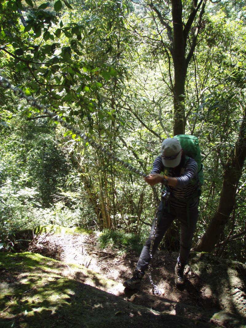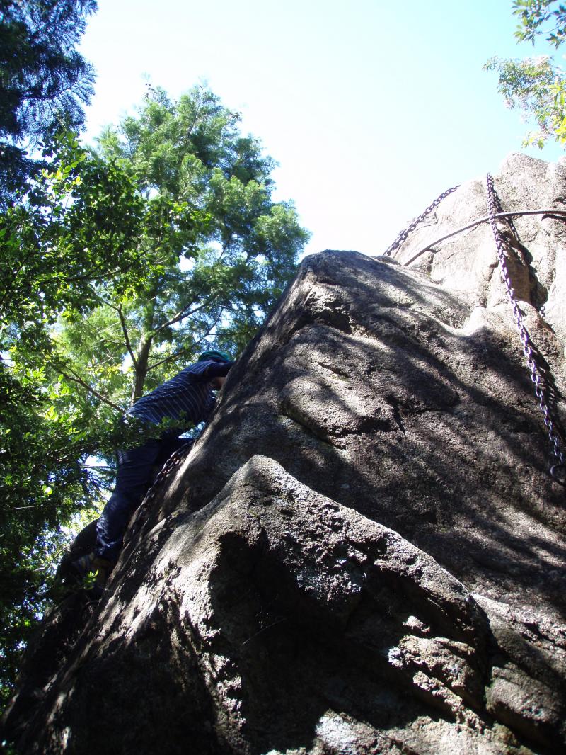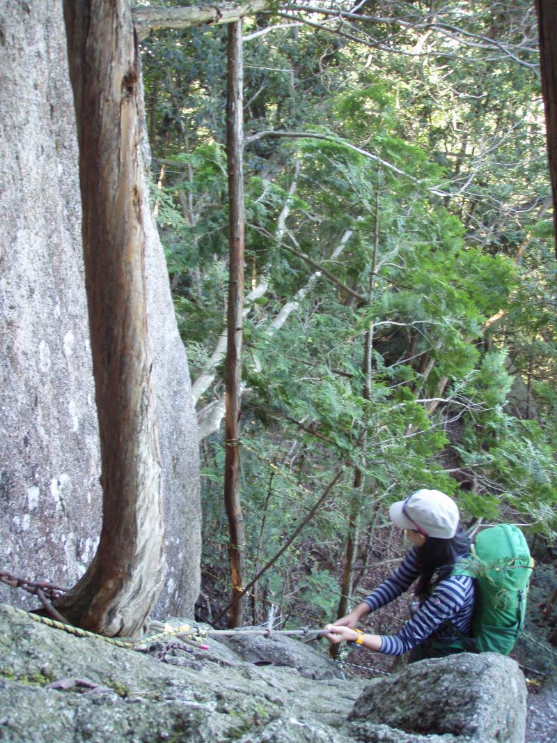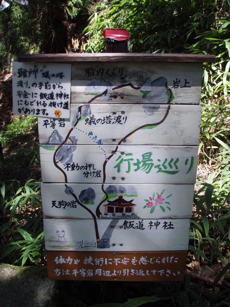 宮町登山口の先にある駐車場から出発。山道を半時間歩くと、飯道神社に到着。ここから左奥に進むと行場コース。鎖を伝っての上り下りや、狭い岩穴に潜り込んだりしますので、体力に自信の無い方はお避け下さい。