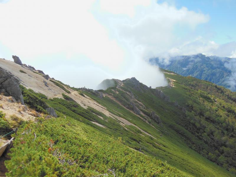 この時までは天候もまだ落ち着いていて、ところどころ晴れてはいたのですが、燕山荘から大天井岳に向かう