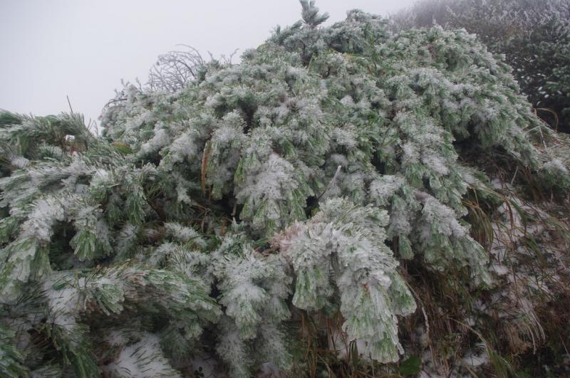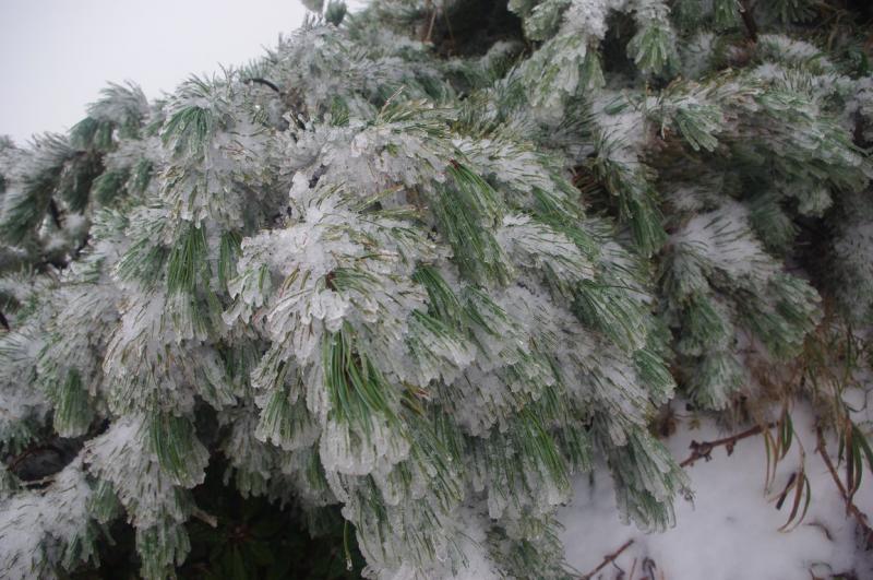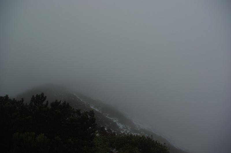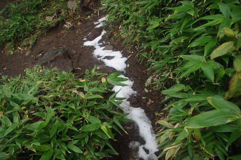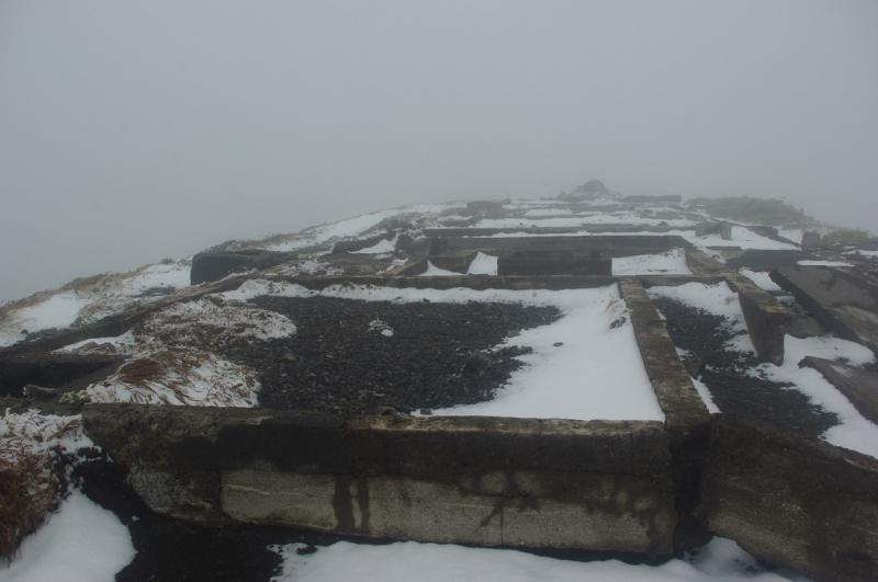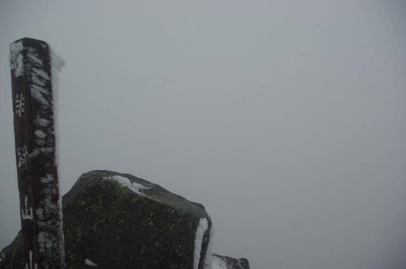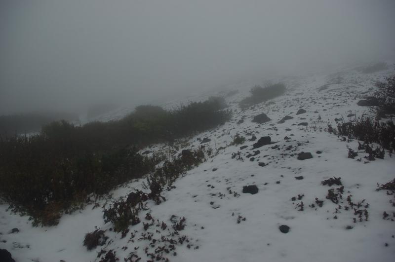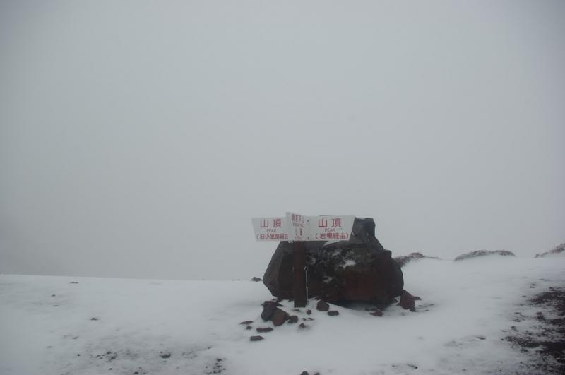 歩き始めは落ち着いた天気でしたが、7号目付近から完全にガスの中。視界も悪くなりやがて登山道は雪に覆われるようになりました。5~10センチ程度ですが、気温がかなり低い!頂上についたときは冷え性の私の手はかなり凍えてました。そんなわけで長居することなく下山。登山口のキャンプ場についてから温かいお茶を飲みました。