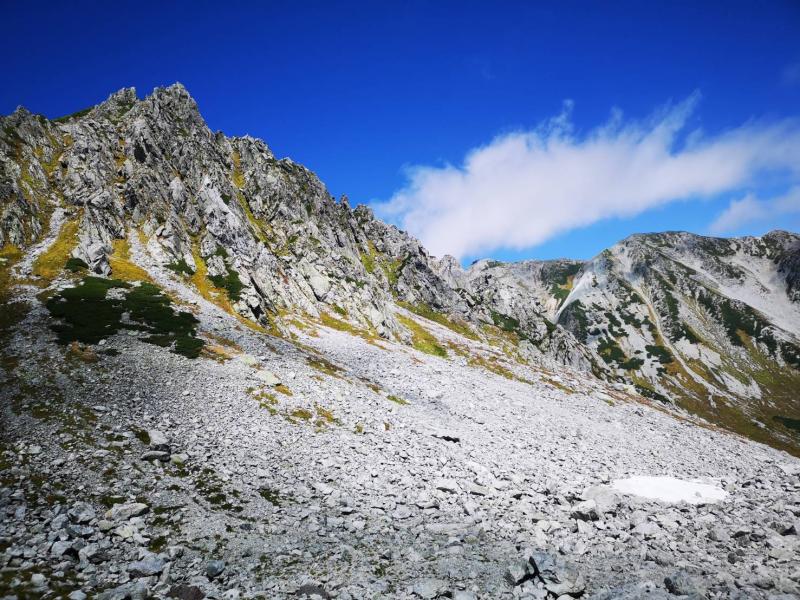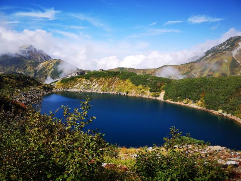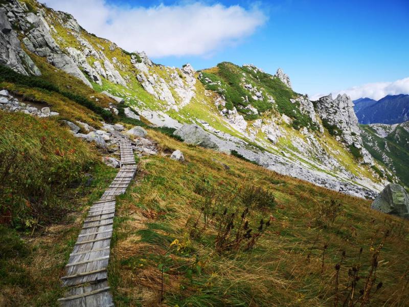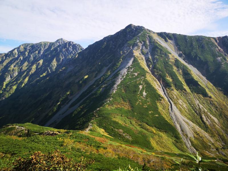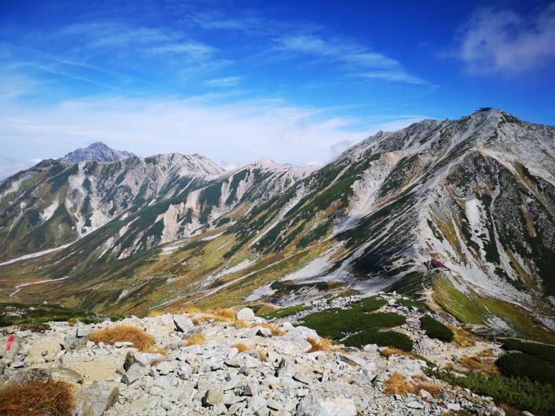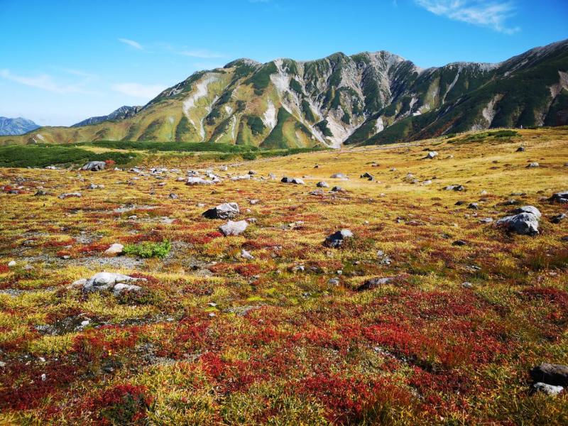 前日の仕事が遅くなってしまい、2時間程度の仮眠で扇沢の始発に間に合うように出発したので、せっかくのアルペンルート乗り物天国もうつらうつら。重い足取りでなんとか室堂までたどり着くと、そこにはどどんと構える巨大な立山。眠気が吹き飛ぶほどの存在感で迫ってきました。色付き始めた山肌を眺めていると気持ちが不思議と落ち着いてきたので、急ぐ旅でもないし、欲張らずにのんびりと景色を楽しみながら歩くことに決めました。