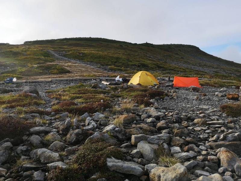 ・五色ヶ原山荘からテント場まで15分ほど。一張700円。水場あり、2つのうち1つは枯れていました。人感センサーライト付きの立派なトイレがあります。