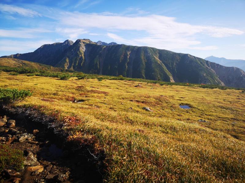 テント撤収後、先へ進むか、戻って立山へ登るか、楽しい選択肢はいろいろありましたが、時間の許す限り湿原を散策するという、最も贅沢なプランをチョイス。昔歩いた裏銀座や、辛かった蓮華の大下りなど、過去の思い出に浸ったり、まだ行ったことのない薬師や赤牛に思いを馳せたり、湿原の心地よい風に包まれながら気ままにのんびりと過ごしました。
